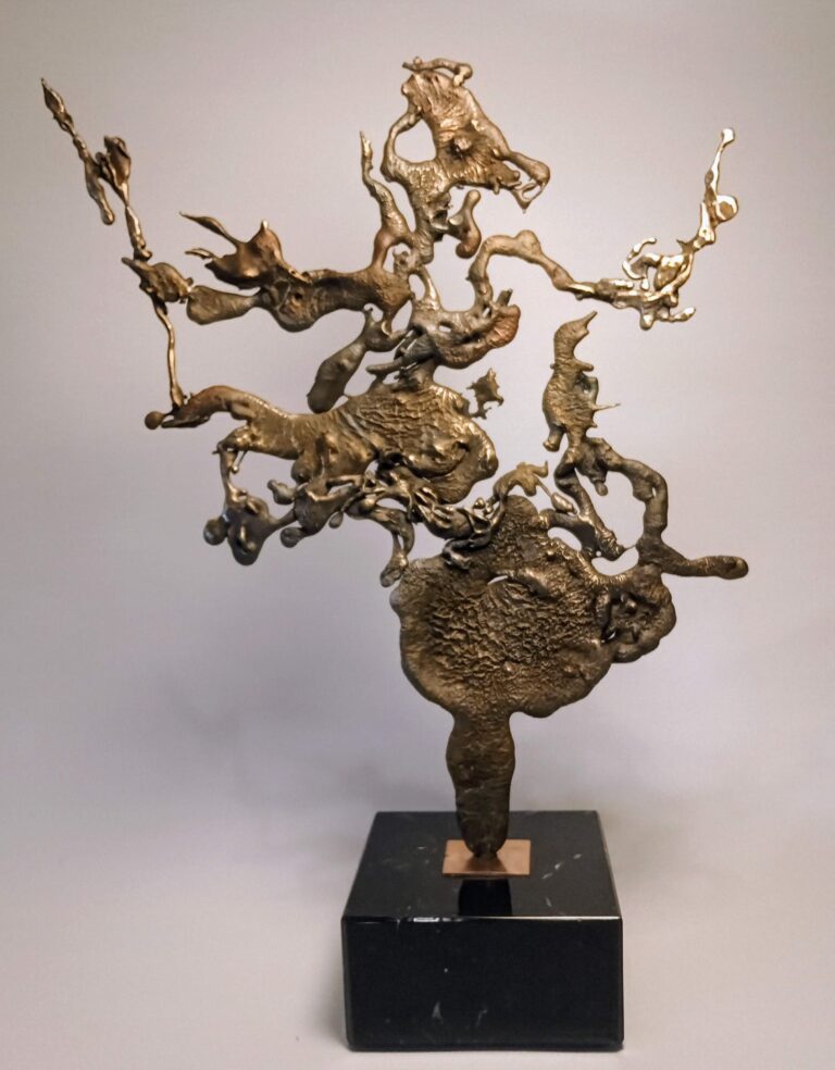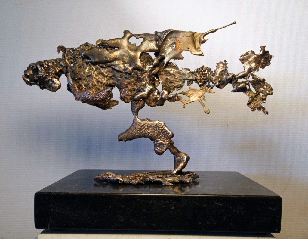 Bloem. Twee dimensionaal beeld. Brons, gepatineerd, eigen gietwerk (in zand). Voet imitatie marmer. Afmetingen 57 cm x 16 cm.(hxb) ( inclusief voet)